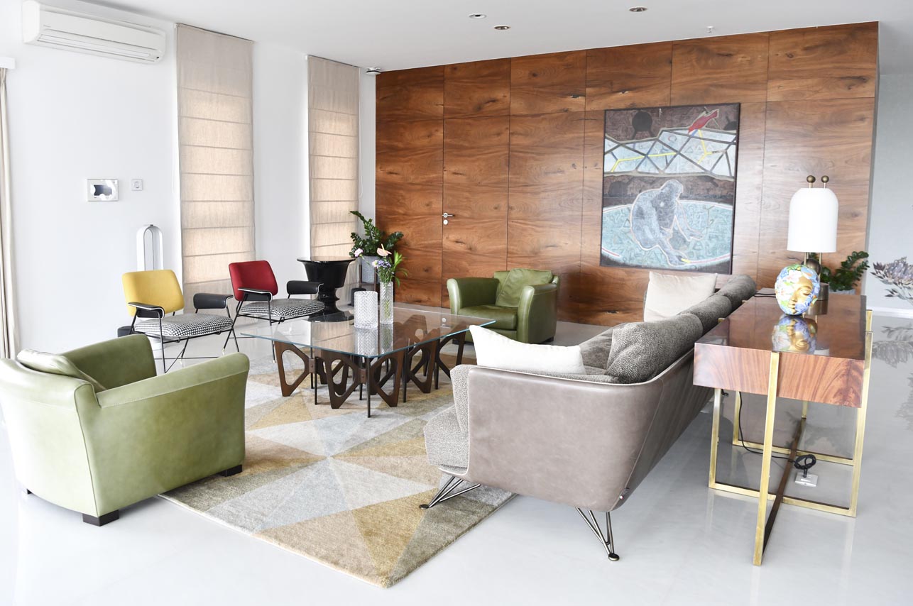 The intimacy of this space opens into the large expanse of living and dining is subtly broken into three areas. On entering the living room, an informal seating area is partitioned from the dining by a freestanding teak modernist screen with brass trims. An L wall clad in rich mahogany veneer anchors the main living area to its north. It conceals the door to a bedroom and also houses storage of bar and linen.